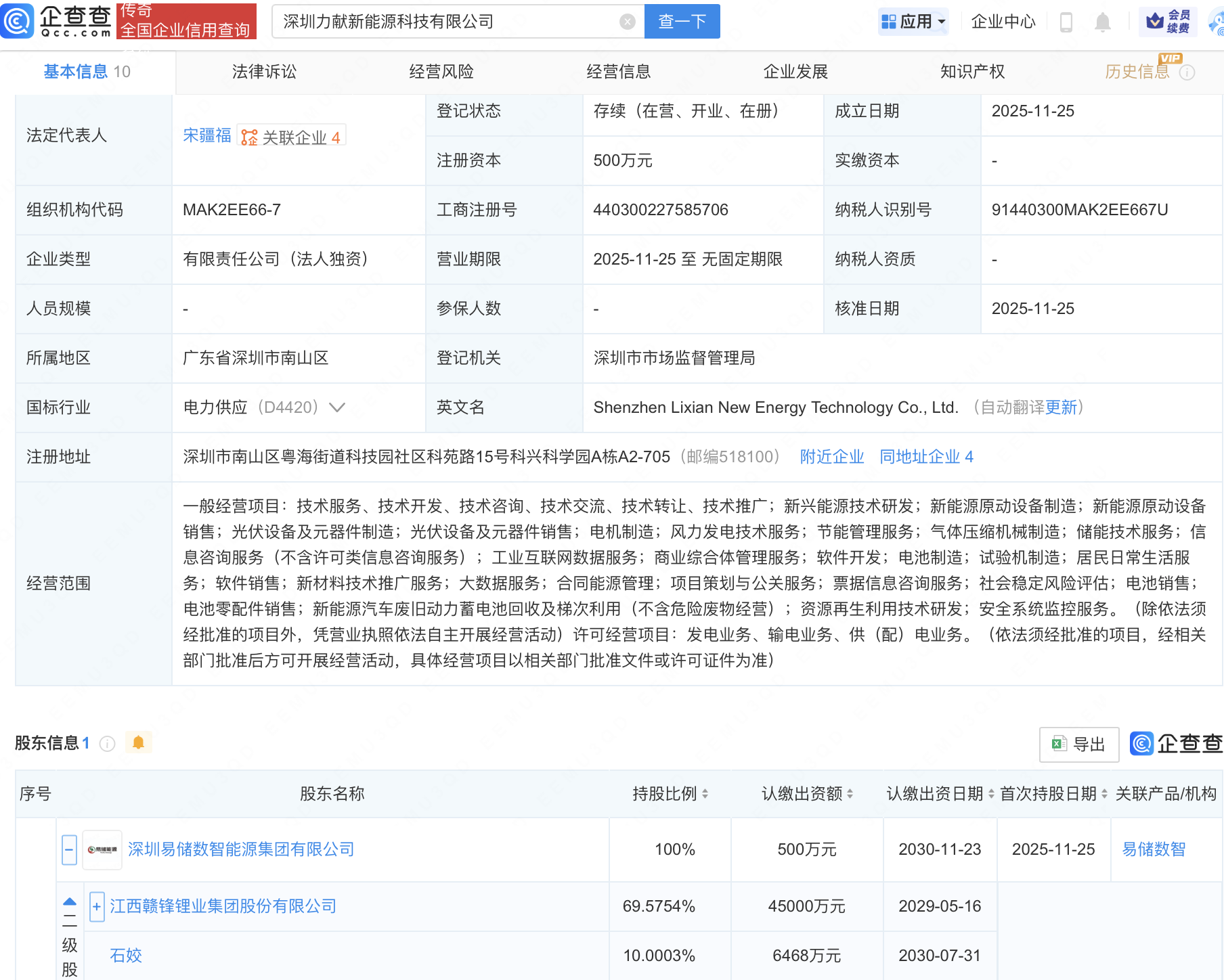 近日,深圳力献新能源科技有限公司成立,经营范围包含:电池销售;电池零配件销售;新能源汽车废旧动力蓄电池回收及梯次利用(不含危险废物经营);资源再生利用技术研发等。企查查股权穿透显示,该公司由赣锋锂业(002460)旗下深圳易储数智能源集团有限公司全资持股。